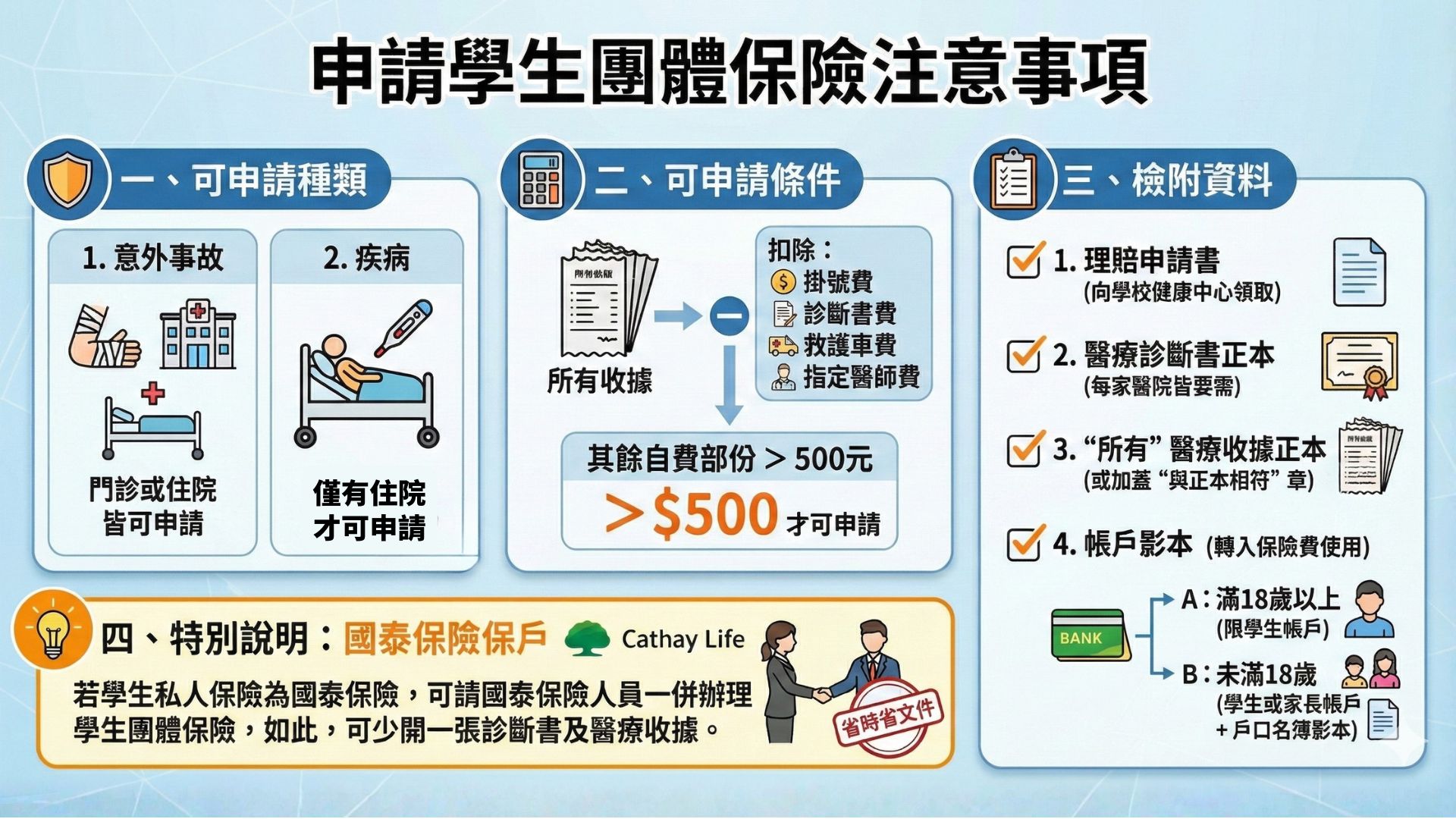 親愛的同學及家長,您好:- 理賠申請書(可向健康中心領取或網頁下載https://www.cathaylife.com.tw/cathaylife/-/media/7110975faef24e2bb72713db5cd0c861?v=8)。