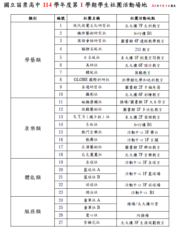 社團活動場地一覽表
